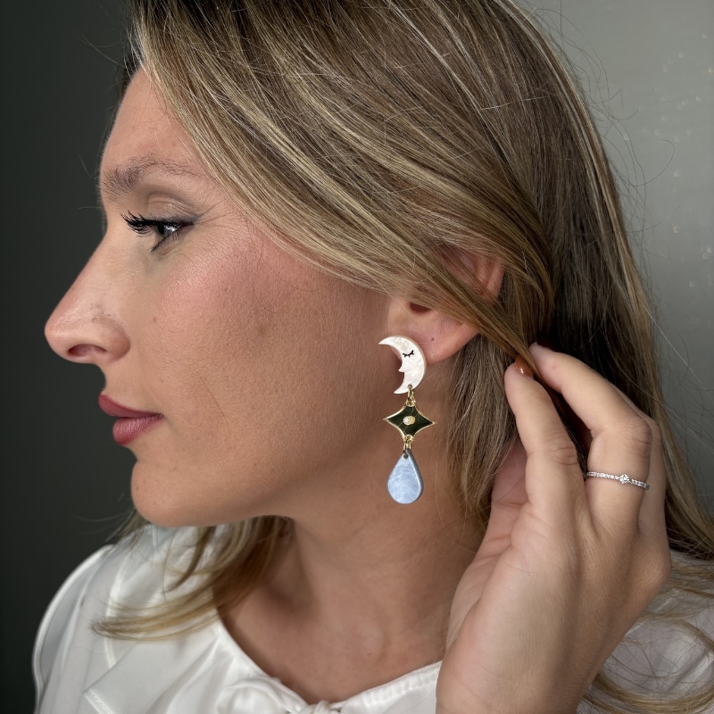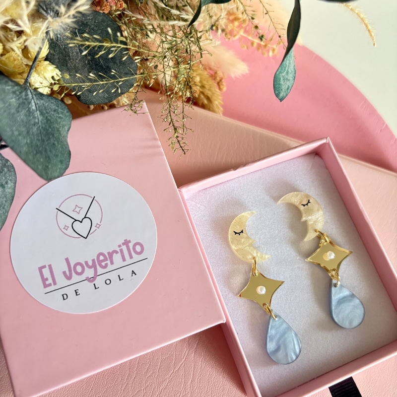 Material: Metacrilato nacarado y espejo. Detalles pintados a mano. Perno y enganches de acero inoxidable.